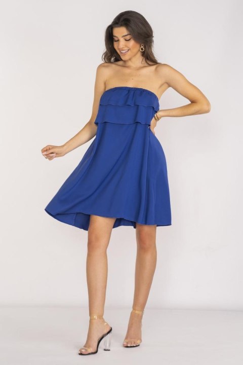 Sukienka typu hiszpanka, która pięknie eksponuje ramiona i nogi. Trapezowy, prosty i luźny krój sprawia że pasuje na każdą sylwetkę. Dwie falbanki wszyte w gumkę sukienki przy dekolcie dodają jej uroku. Sukienka uszyta z delikatnego i lejącego materiału. Idealna na każdą okazję, można zestawić ją z trampkami by spotkać się ze znajomymi, jak i dobrać do niej buty na obcasie i pójść na randkę.