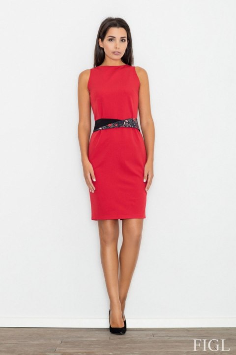 Prosta sukienka bez rękawków zapinana na kryty zamek. W pasie dwukolorowa szarfa do wiązania.